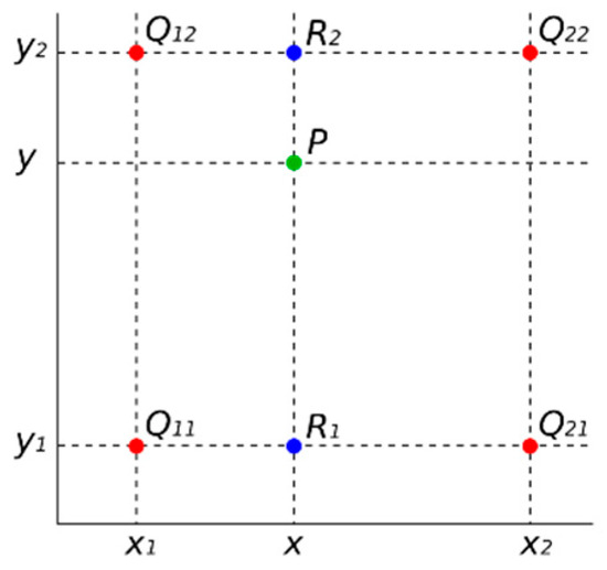 First, interpolation is performed in the x direction to obtain R1 and R2. Then, interpolation is conducted in the y direction to derive P, as represented in Equations (7)–(9).
