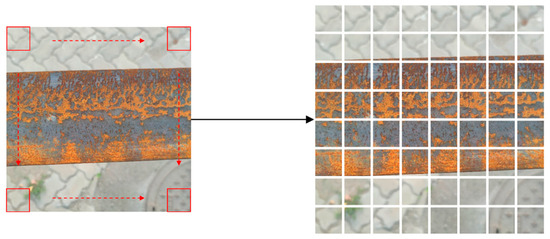 Due to the diverse and complex colors of the background, along with some backgrounds having shapes similar to the target components, directly training a conventional deep neural network model to assess corrosion levels could lead to misclassification. Therefore, this study employed OpenCV to load images and defined a fixed-size window that moved across the image with a predetermined step size, thereby implementing sliding window sampling. Subsequently, windows that met the model’s input requirements were selected and classified using a pre-trained model, thus mitigating the interference of the background on the classification model’s decision-making. The sliding window scanned the image with either equal or variable step sizes, and the scan results were used as input for the model. The pixel values of the sampled images were set to 512 × 512 pixels. To ensure the sampling count was an integer and fully covered the image, the window size was set to 64 × 64 pixels with a step size of 64 pixels, as illustrated in Figure 14.