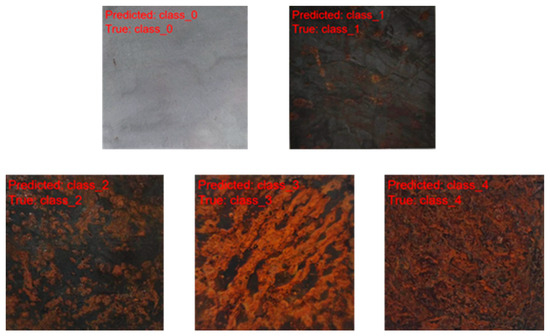 From the group of feature maps, it can be observed that some feature maps exhibit contours that align with the corrosion profiles of the corrosion image samples. This indicates that the convolutional layers successfully extract and output information regarding the shape of the corrosion present in the image. Additionally, regions of deeper color in certain feature maps correspond roughly to the locations of corrosion in the original image, suggesting that these convolutional layers capture corrosion characteristics, thus indicating that the model has developed the ability to distinguish between corroded and non-corroded areas. Conversely, a few feature maps show little to no significant changes and present monotonous colors, indicating that the features present in the input image do not correspond with the features available in this convolutional layer, resulting in the inability to extract relevant image characteristics. Overall, the corrosion features in the corrosion images are reflected in the feature maps following convolution, and the Inception v3 model possesses the capability to discern and assess the corrosion levels of the images. As shown in Figure 18, the model can output predicted categories of corrosion images, which align with the actual grade categories.