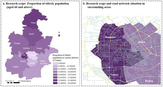 Research scope (author’s own representation). (a) Research scope: Proportion of elderly population (aged 60 and above); (b) Research scope and road network situation in surrounding areas.