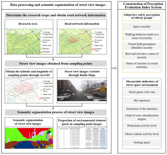The main types of data sources in this article include street view image data and the subjective ratings of seniors on the safety perception of the sample street view images. Among them, an evaluation system is used to construct environmental measurement indicators affecting spatial security, and sampling points are determined through road network data; street view data are used to extract street environment elements, and SD semantic analysis and Likert scale methods are adopted to determine the measurement indicators of street environment elements related to the subjective perception of seniors.