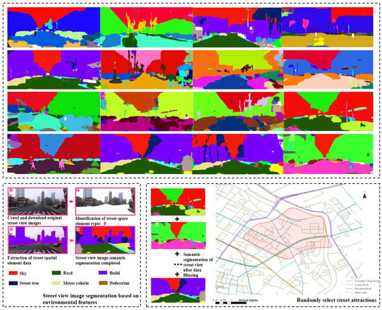 Based on theoretical research on how the built environment [28] and the psychological state of seniors and their social interactions affect individuals’ behavior and perceptions, and considering the characteristics of visual elements and environmental factors that influence the walking behavior of older adults [6], the semantic segmentation of street view images resulted in the identification of 35 visual elements, including buildings, cars, sidewalks, grass, and shops, as objective environmental indicators.