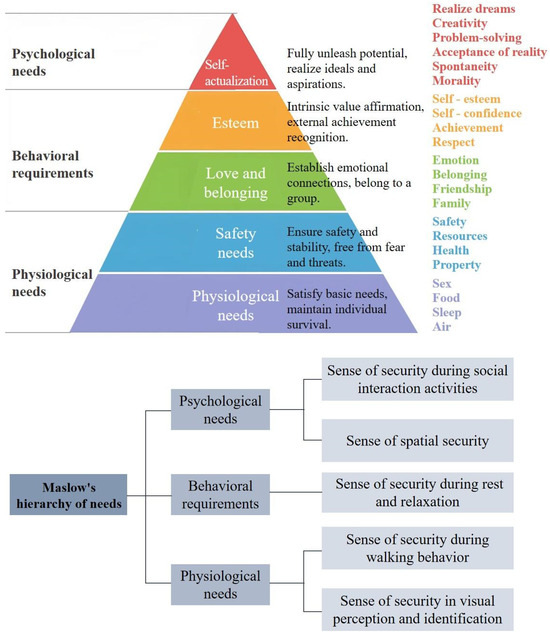 Seniors’ perception of street space safety based on Maslow’s hierarchy of needs theory (top image obtained from Abraham Maslow’s 1943 work The Theory of Human Motivation [30]; bottom picture created by the author).