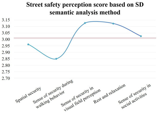 The targeted analysis of various indicators of seniors’ perception of security was conducted, and the average score of each evaluation factor was calculated. According to the SD method, the results of each indicator were calculated, with each SD semantic adjective as the horizontal axis and the corresponding score of the indicator as the vertical axis, and an evaluation score curve graph was created (as shown in Figure 7). Based on the street view images, it can be seen that the average score for seniors’ evaluation of the sense of security in living street spaces is 3.02 points. Among them, the three indicators of perceived and recognized security in street spaces, sense of security during rest and relaxation, and sense of security in social activities are all above average, with perceived and recognized security in street spaces having the highest score, reaching 3.13. Spatial security in the street and sense of security during walking behavior are both below average, with the lowest score for sense of security during walking behavior (2.85).