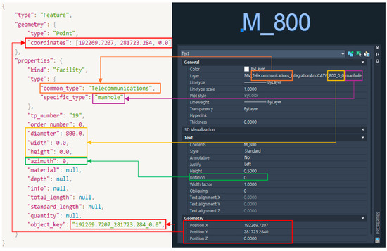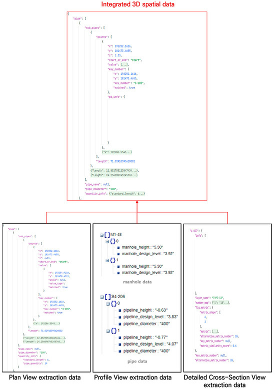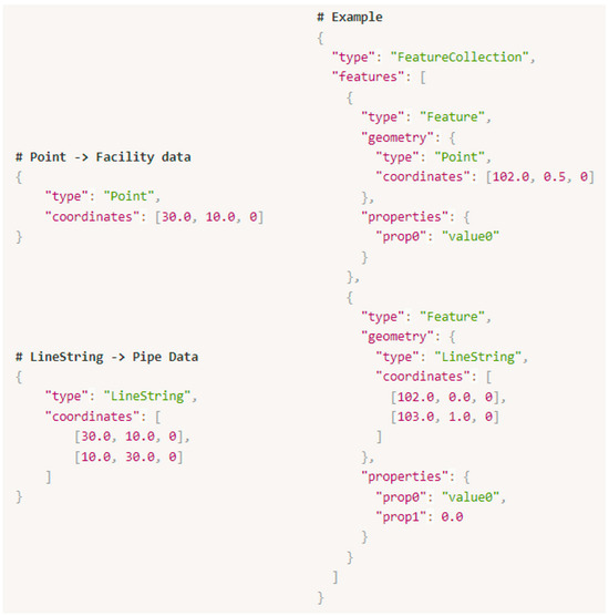 Subsequently, using a spatial data extraction and processing algorithm module, the standardized drawings are converted into 3D spatial data in the GeoJSON format. GeoJSON is an open format that efficiently manages both spatial and non-spatial information, enabling the seamless integration of underground utility data with various GIS systems and 3D modeling tools.