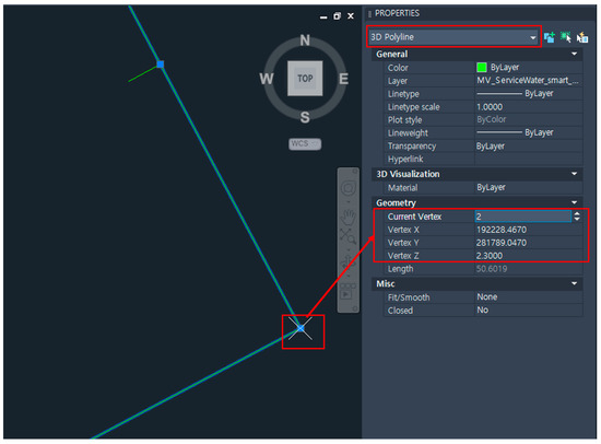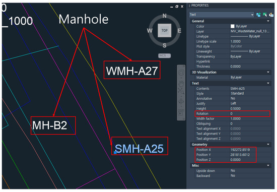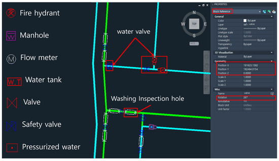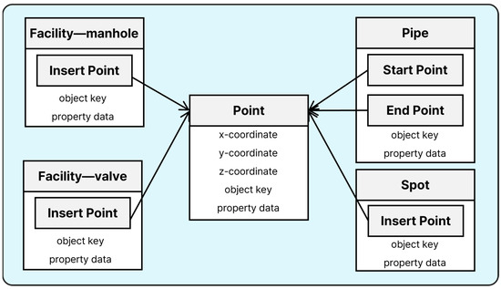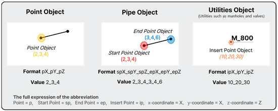 The 3D spatial information consists of the location, shape, and other attribute data of underground utilities. Location information is represented as points (x, y, z), which are used to generate connection relationship data between utilities [25]. The shape information describes the form and dimensions of utilities in the 3D space, including parameters like diameter, width, and height [26]. By utilizing location and shape data, 3D modeling can be created, and this can be integrated with other attribute information such as the type and name of the underground utility to process BIM data.