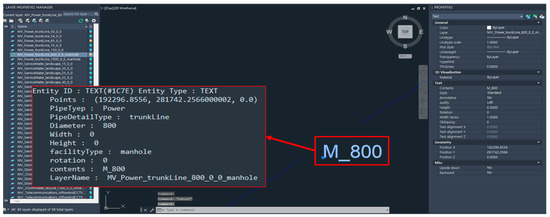 Using a custom Python-based module for generating and processing underground facility objects, combined with the ezdxf library [17], CAD files in the DXF format were processed to extract geometric and attribute data. The extracted data were integrated into a unified dataset, enabling the creation of non-redundant objects representing individual underground facilities. Subsequently, 3D spatial analyses were performed on the generated objects to establish inter-object relationships, ensuring a comprehensive representation of their connectivity within the spatial environment.