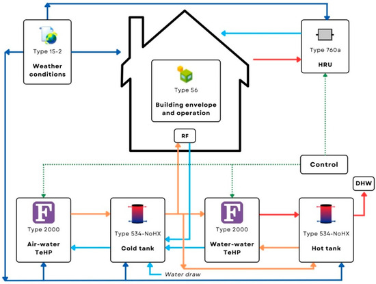 The following section describes the computational model developed to evaluate the thermal performance of the selected dwelling endowed with the cited TeHPs. This model is implemented and analyzed in TRNSYS 17, which is a software for dynamic evaluation of multi-zone buildings. The dwelling is implemented by Type 56, which introduces geometric and thermal properties, solar radiation, internal gains, ventilation, infiltrations, etc. Likewise, Type 15 introduces the weather conditions, taken from the database of METEONORM. This is described in Section 2.2.1. Also, the heat recovery heat exchanger (HRU) is modeled by Type 760a, whereas the tanks are introduced by Type 534-NoHX. Finally, to integrate the simulation of the TeHPs, a new Type was implemented, described in Section 2.2.2. A schematic illustration of the TRNSYS model can be seen in Figure 5.