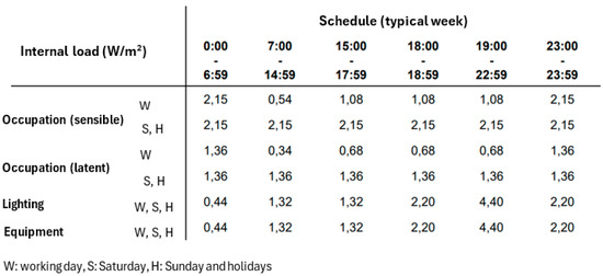 As indicated, Type 56 introduces in TRNSYS the features and boundary conditions of the dwelling in terms of envelope, ventilation, internal gains and climate conditions. One of the gains is the heat released by people, for which the occupancy is determined according to ref. [32], which defines the use profiles of private residential spaces in Spain. Also, heat gains due to lighting and equipment are included based on the same regulation. All these are shown in Figure 6.