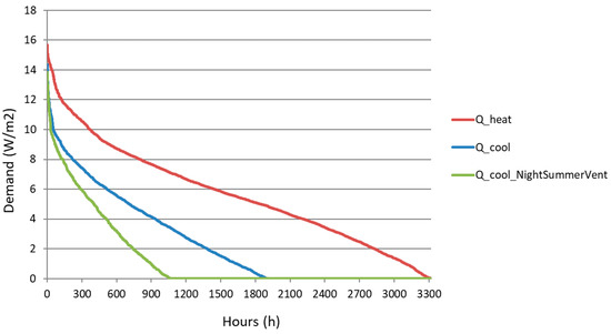 In this regard, the evaluation of the difference between heat losses (ventilation and envelope) and heat gains (solar and internal) allows the calculation of the heating demand of the dwelling throughout the year. The dynamic model provides the heating demand shown in Figure 7, which turns out to be 18.88 kWh/m2 per year (area under the red curve) with a peak demand of 15.67 W/m2.