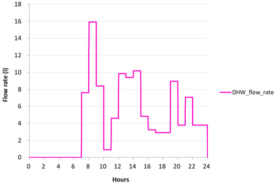 Additionally, the heat demand for DHW has been calculated considering that the cold water coming from the network is at 15 °C and must reach 45 °C to be used as DHW, as indicated in ref. [32]. The consumption profile per person is shown in Figure 8 [32], which, given that 4 people are living in the dwelling, leads to a daily consumption of 112 liters. All this leads to a heat demand for DHW of 19.41 kWh/m2 per year.