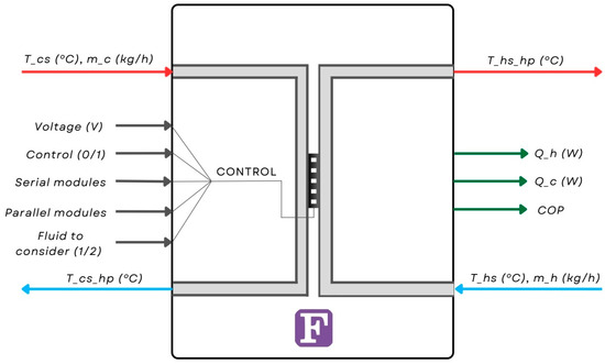 To integrate the simple model in TRNSYS, a new Type was implemented, whose general schematic overview can be seen in Figure 10. The Type introduces the temperature and mass flow of both fluid streams, the voltage, the on/off control signal, the number of TEM in series and in parallel and the signal that specifies which fluid flows through each side of the TEM. With respect to the voltage, it is one of the most important aspects to be configured, since the lower the voltage applied, the higher the COP of the TEM [11,19]. Also, the number of TEMs both in series and in parallel is very relevant, as the higher the number of devices, the lower the voltage that will need to be applied to each of them [11,19]. However, if the number of TEMs increases, so does the consumption of auxiliary equipment. Therefore, there is an optimal number of TEMs that maximizes the COP of the TeHP. This study can be seen in Section 2.3.1.