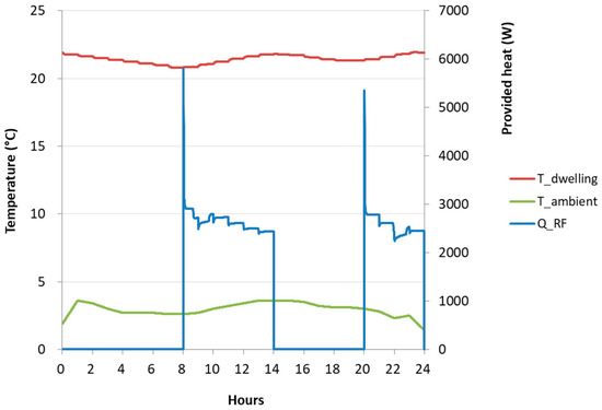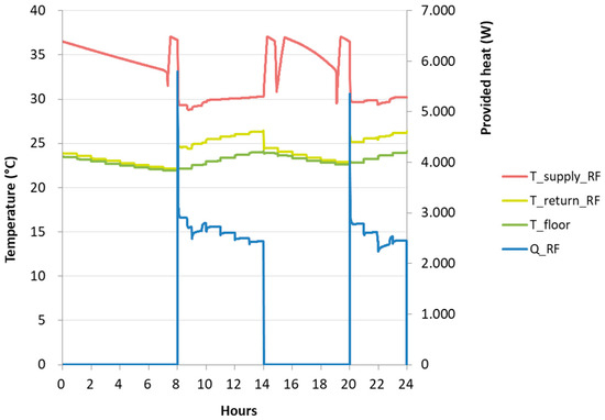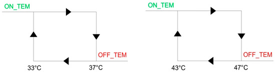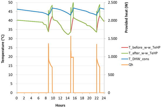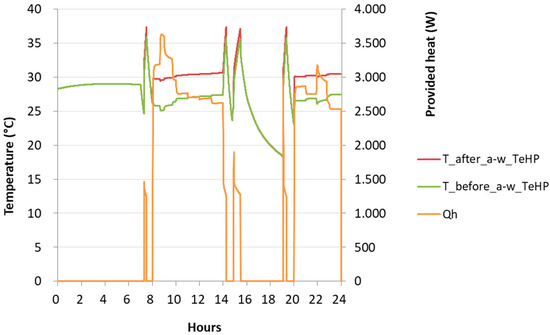 Regarding the control signals to activate/deactivate the TEMS, the first option under consideration is an on/off system depending on the thermostats, which are configured under hysteresis depending on the set point temperatures. In the case of the a–w TeHP, it turns on when the supply temperature of the RF is less than 33 °C, and off when it reaches 37 °C. This is expected to maintain a supply temperature to the RF high enough to ensure the comfort of the occupants, with at least 20 °C in the dwelling. In the case of the w–w TeHP, it activates when the DHW supply temperature drops below 43 °C and deactivates when it reaches 47 °C, aimed to provide DHW at a minimum temperature of 43 °C. Both hysteresis can be seen in Figure 11.