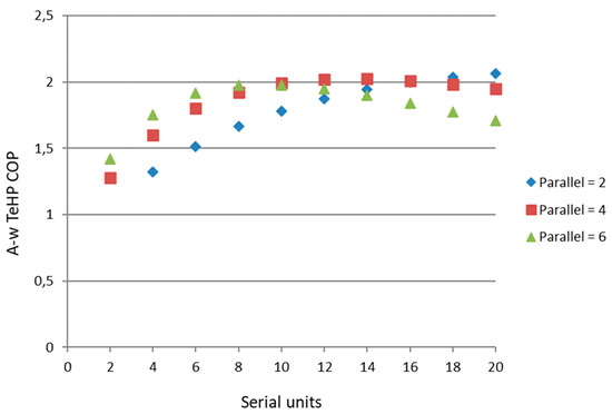 The model for the TeHP described in Section 2.2.2 allows obtaining the results displayed in Figure 12, which shows the COP of the a–w TeHP for different arrangements of the TEMS. It shows that, if 2 modules are placed in parallel, 20 units in series are required to reach the maximum COP (2P;20S); if 4 are arranged in parallel, the maximum COP is reached with 14 units in series (4P;14S); and if 6 units are placed in parallel, the maximum COP is achieved with 10 modules in series (6P;10S).
