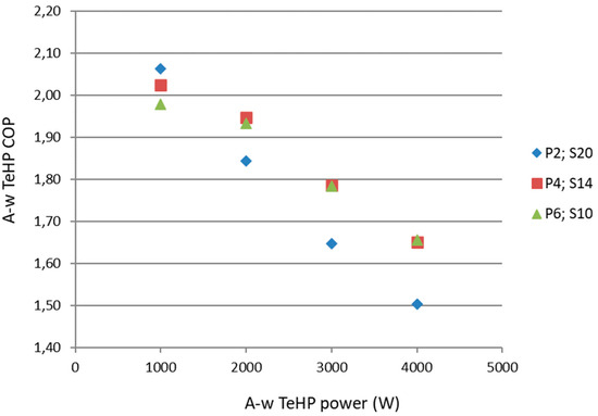 Among these three configurations (2P;20S, 4P;14S, 6P;10S), the one selected is that which performs better at high heating power. This ensures good performance when rapid heating is needed. In this regard, Figure 13 presents the COP of the a–w TeHP relative to the heating power. The COP clearly decreases with power, the reason being that the voltage supplied to the TEMs must unavoidably increase as the power increases, and this leads to a lower COP. Figure 13 indicates that the configuration with 2 TEMs in parallel and 20 in series is the worst at high demands. The other two configurations perform alike at high power, and, given that the arrangement of 4 units in parallel and 14 in series performs better at 1000 W, this is the configuration selected for the a–w TeHP.