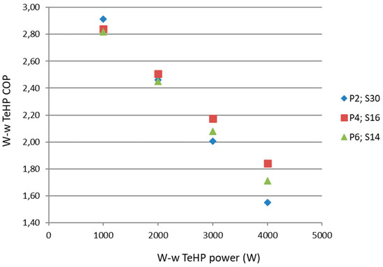 In this case, 2 parallel-30 series presents the worst performance at high power and is therefore discarded. Regarding the other two alternatives, the 4 parallel-16 series is selected as presenting higher COP in the whole range. This is the final configuration of the w–w TeHP.