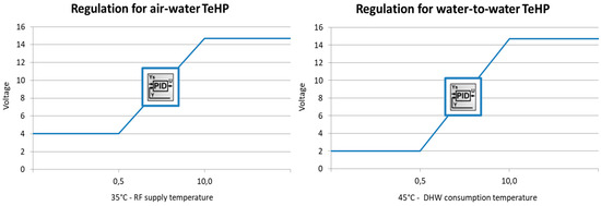After establishing the voltage limits, a proper regulation must be set, since applying only the maximum and minimum voltages (the so-called on/off control system) significantly decreases the COP [37,38]. In a first design, it was decided to use a regulation based on a straight line depending on the thermal jump to be provided to the water stream. In the a–w TeHP, when the RF supply temperature was 0.5 °C lower than 35 °C, the minimum voltage would be applied, whereas the maximum voltage would be applied if it reached 10 °C. For the w–w TeHP, the procedure was similar but with a set temperature for DHW of 45 °C. This control was tested in the first place, and it was proven to produce peaks of voltage that caused a decrease in the COP. To solve this problem, a Proportional–Integral–Derivative (PID) controller was implemented, which generated a smoother response. Figure 16 shows the final control mechanism that has been deployed in both TeHPs.