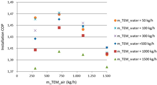 The TRNSYS model with the boundary conditions introduced in Section 2.3.1, along with the number of TEMs in each TeHP, the heat exchangers and the voltage regulation described in previous sections are deployed to obtain the mass flow rates of these water streams to maximize the COP. As can be seen in Figure 17, maximum COP is reached with m_TEM_air= 700 kg/h and m_TEM_water= 100 kg/h, that is, when 700 kg/h are circulated to the a–w TeHP from the cold tank, and when 100 kg/h are extracted from both tanks in the direction of the w–w TeHP. This mass flow regime will remain constant every time the TeHPs are activated.