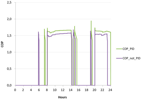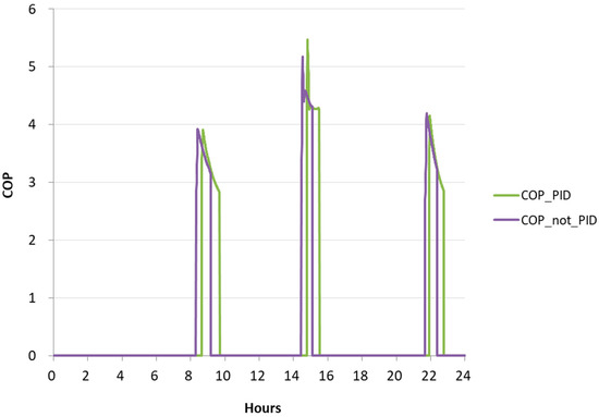 Type 23 was used to implement this control in TRNSYS. The gain as well as the integration and derivation time were adjusted. For this purpose, an optimization process of these parameters was carried out to maximize the COP of both TeHPs. In this process, the gain of the PID was adjusted to the slope of the straight line previously mentioned, resulting 1.1263 for the a–w TeHP and 1.3368 for the w–w TeHP. The derivation time was canceled because the system did not show oscillations. The integration time was selected for both controllers to maximize the COP of both TeHPs, this being 100 h for the a–w TeHP and 20 h for the w–w TeHP. It was checked that the voltage level response produced by the controller was always between the minimum and maximum voltage previously set.