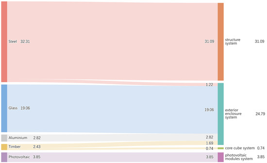The results show that the main building of C-house (excluding interior decoration, foundation, etc.) can be divided into 523 components by the component design method. The core tube system has eight components, all of which are made of timber; the structural system has 172 components, all of which are made of steel; the exterior enclosure system has 75 components, mainly glass and aluminum alloy materials; and the photovoltaic system has 268 components, all made of polycrystalline silicon (see Figure 6).