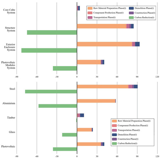 The carbon emissions of various components are calculated based on the component types. The total mass of the eight core tube system components is 738.06 kg, and their whole-process carbon emissions amount to 4416.05 kg (raw material preparation phase: 257.07 kg; component production phase: 119.18 kg; transportation phase: 1435.72 kg; construction phase: 74.4 kg; demolition phase: 2529.68 kg), with a carbon reduction of 376.25 kg. The total mass of the 172 structure system components is 31,089.21 kg, and their whole-process carbon emissions amount to 84,795.71 kg (raw material preparation phase: 73,343.3 kg; component production phase: 1114.89 kg; transportation phase: 3976.36 kg; construction phase: 2511.2 kg; demolition phase: 3849.96 kg), with a carbon reduction of 74,458.19 kg. The total mass of the 75 exterior enclosure system components is 24,791.75 kg, and their whole-process carbon emissions amount to 93,753.06 kg (raw material preparation phase: 82,145.92 kg; component production phase: 701.57 kg; transportation phase: 3767.72 kg; construction phase: 702.8 kg; demolition phase: 6435.05 kg), with a carbon reduction of 82,847.49 kg. The total mass of the 268 photovoltaic modules is 3854.73 kg, and their whole-process carbon emissions amount to 40,857.89 kg (raw material preparation phase: 35,741.71 kg; component production phase: 0 kg; transportation phase: 68.91 kg; construction phase: 2492.4 kg; demolition phase: 2554.87 kg), with a carbon reduction of 35,741.71 kg.