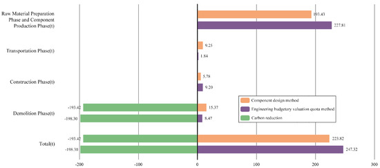 The results of the two calculation approaches are shown in Figure 7. When using the component method to calculate carbon emissions, it is possible to determine the carbon emissions of each component at various stages, allowing for a multi-angle analysis of building carbon emissions based on component types and material types. This is a unique advantage of the component method.