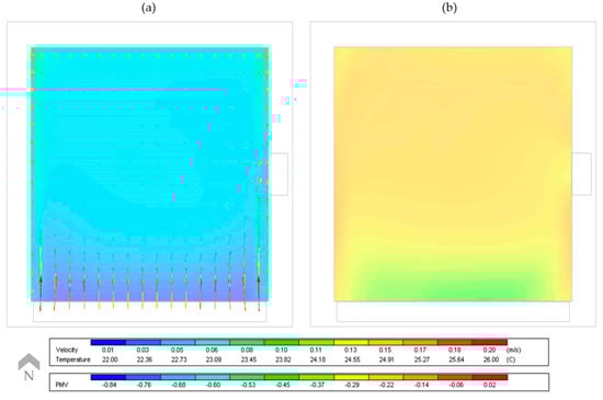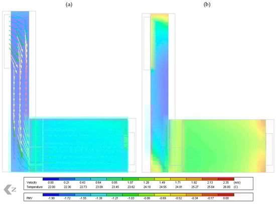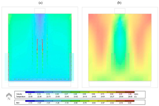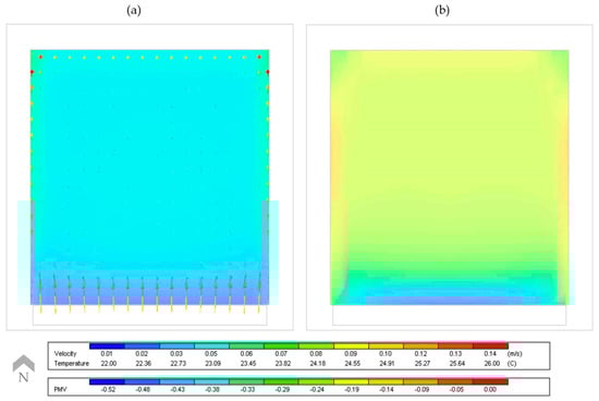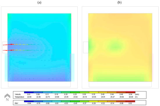 CFD analysis of single-sided ventilation with an S-facing window: (a) fluctuation of indoor air temperature and velocity, (b) thermal comfort (PMV) distribution.