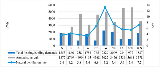 The cross-ventilated test rooms, featuring windows positioned on opposite sides, exhibited greater potential for natural ventilation. Among these, the test room with a north-south (NS) orientation demonstrated lower heating demand, cooling demand, solar gain, and average natural ventilation rate, as illustrated in Table 6. Conversely, the test room with an east-west (EW) orientation experienced higher levels of heating demand, cooling demand, solar gain, and average natural ventilation rate compared to the NS orientation.