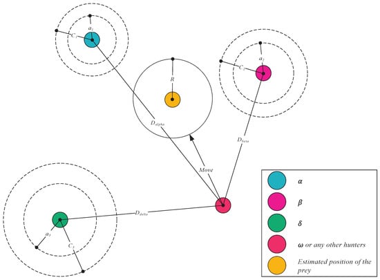 Where , , and are the distances from wolf ω to the α, β, and δ wolves, respectively, , and are the positions of the α, β, and δ wolves, respectively. , , , , , and are coefficient vectors , , and are the final positions of the α, β, and δ wolves, and is the final position of the prey. The process of individual wolves tracking and prey orientation is depicted in Figure 4.