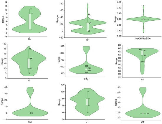 This study employs 11 input parameters provided from cubic concrete samples to predict GeC, with the necessary database collected from the study performed by Verma []. The current investigation aims to devise a plan to aid users in enhancing different aspects of GeC for construction purposes. The input and output parameters, as well as their specifications, are presented in Table 2. A total of 63 data points are prepared to obtain the GeC database. FA, RP, CT, CP, NaOH/Na2SiO3, Su, EW, M, AAB, CA, and FAg are identified as input parameters for training artificial intelligence models, while GeC is considered as the output parameter for the AI process.
