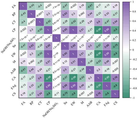 The strength of geopolymer concrete is influenced by a multitude of factors, encompassing both external and internal parameters. External factors, such as temperature, curing duration, humidity levels, and air entrainment, play significant roles, while internal factors include the quality of materials and their compositions []. Compositional attributes of binding materials and particle sizes are crucial for initiating and enhancing reactions, with their proportions governing the strength of said reactions, as per requirements []. Incrementing slag content in the composition augments the compressive strength of ambient-cured geopolymer concrete []. Moreover, finer particles of fly ash and slag facilitate rapid reactions due to their increased surface area availability, thereby enhancing early concrete strength []. The liquid-to-binder ratio also significantly impacts reaction kinetics and resultant strength []. Although water is essential for initiating geopolymer reactions, its role diminishes as it evaporates during the hardening process, necessitating only a small quantity of liquid to react with all concrete components. The optimal liquid content directly influences geopolymer concrete strength [,].