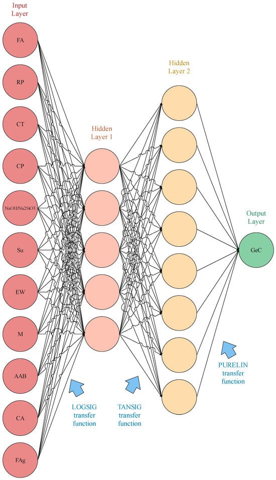 The evaluation of outcomes in this study utilized a technique termed Color Intensity Rating (CIR), which serves as a creative and quantitative tool for selecting the optimal Artificial Neural Network (ANN) architecture. Within the CIR approach, each architecture is assigned a specific color, with higher-rated models depicted with a higher color intensity. Conversely, lower-rated models exhibit reduced color intensity, potentially appearing almost entirely white. The shading of all numbers in Table 3 was adjusted accordingly based on this methodological approach. Among the ten distinct topologies presented in Table 3, an MLP model with the highest accuracy was considered as the most suitably designed MLP architecture. ANN4, with the highest rating of 59, was selected as the ideal architecture due to its superior performance compared to the other MLPs. Moreover, based on the CIR rating procedure, ANN4 was assigned the maximum color intensity, signifying its accuracy and effectiveness in predicting GeC. Consequently, ANN4 emerged as the optimal ANN model for GeC prediction, featuring a structure of 11–5–8–1 and transfer functions of “logsig” for the input and hidden layers, and “tansig” for the output layer. Figure 7 displays the identified topology selected, along with the architecture generated by the MATLAB R2024b program.