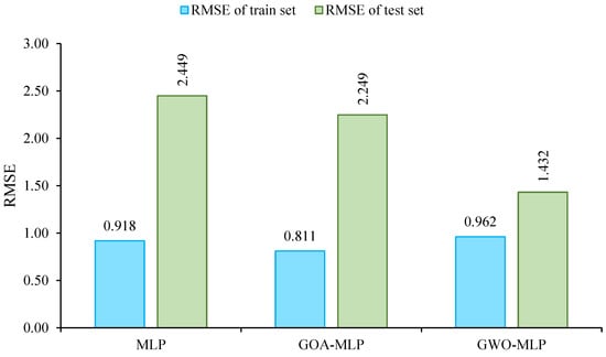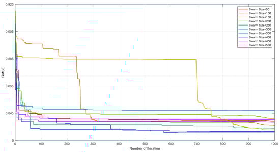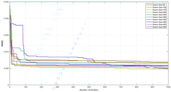 As previously discussed in the GOA methodologies, this optimization algorithm is governed by several factors, including the weight of the gannet, gannet speed, the constant “c”, and the constant in the Levy flight function, all of which influence error reduction as managed by the iteration number. These parameters exert significant influence on the performance of the GOA. In this study, specific values were assigned to these parameters: the weight of the gannet, gannet speed, the constant “c”, and the constant in the Levy flight function were set at 2.5, 1.5, 0.2, and 1.5, respectively. Thus, these parameters, comprising a gannet weight of 2.5, gannet speed of 1.5, “c” of 0.2, and Levy flight function constant of 1.5, were utilized in the GOA–MLP modeling process. Additionally, the iteration number was fixed at 1000 repetitions. However, the parameter determining swarm size necessitated a trial-and-error approach. Hence, swarm sizes ranging from 50 particles to 500 individuals were defined, with the RMSE function employed to evaluate the performance of the GOA.