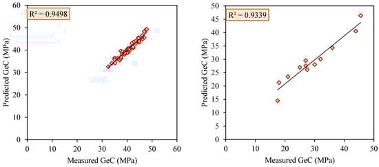 The outcomes of the GOA in optimizing neuron weights and bias values are depicted in Figure 8, which demonstrates the RMSE values achieved for the GOA population sizes. It is observed that the RMSE values of the GOA–MLP model converge across each population size by iteration 623. Multiple GOA–MLP systems were structured to predict GeC based on various swarm sizes, and subsequently, the most optimal GOA–MLP system was selected from ten presented models. To facilitate this selection, Wang’s rating system, as mentioned earlier, was employed. Among the presented GOA–MLP models, the one with population sizes of 350 and a total rating of 60 out of 60 emerged as the superior model. Statistical metrics associated with this model included an R2 of (0.963 and 0.944), RMSE of (0.811 and 2.249), and VAF of (95.781 and 92.862), for the training and testing sets, respectively.