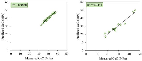 A comparison with previous studies reveals both similarities and differences in the selection of input parameters. Several studies, such as Verma et al. [] and Zhou et al. [], have identified similar factors—such as fly ash content, curing temperature, and alkaline solution ratio—as critical determinants of GeC strength. These factors are consistent with our study, emphasizing their significance in the geopolymerization process. However, some studies have also incorporated additional factors, such as superplasticizer content and particle size distribution, which were not included in this study due to the limitations of the available dataset.