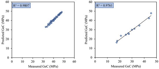 Utilizing models based on historical data, machine learning accurately predicts strength, thus reducing time and labor [] and minimizing errors in predictions [,,,,,]. Among these techniques, artificial neural networks stand out as the most prominent method for predicting concrete strength []. This paper presents a novel approach to predicting the compressive strength of GeC using machine learning techniques, specifically combining MLP with optimization algorithms such as GOA and GWO. The study contributes to the field in several ways: first, it introduces a hybrid machine learning model that significantly improves prediction accuracy over traditional methods. Second, it provides a detailed evaluation of the influence of various input parameters on the compressive strength of GeC, offering valuable insights for optimizing concrete formulations. Third, it demonstrates the application of optimization techniques to fine-tune model parameters, resulting in better generalization performance. The remainder of the paper is organized as follows: Section 2 describes the materials and methods used for data collection and model development. Section 3 highlights the case study and analyzes the available data. Section 4 presents the results and discussion of the model’s performance. Section 5 outlines the conclusion and future work, with recommendations for further improvements in predictive modeling for sustainable construction practices.