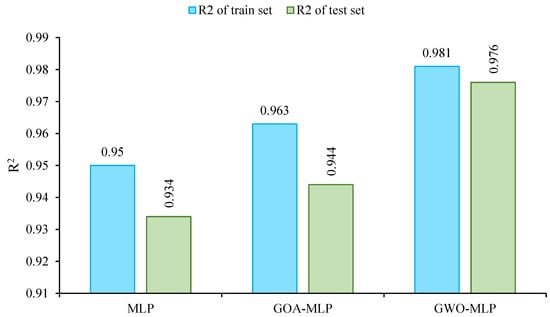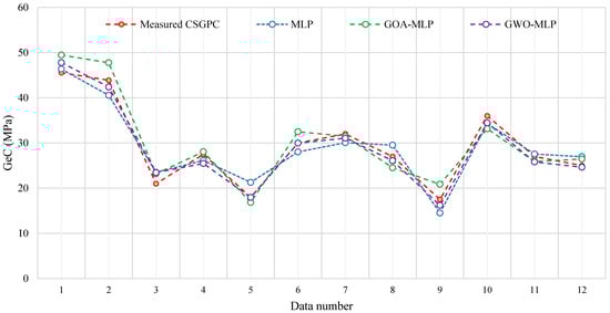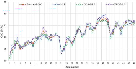 Given the relatively small size of the dataset (63 samples), several strategies were employed to mitigate overfitting and ensure the model’s generalizability. To prevent the model from becoming overly complex and prone to overfitting, a relatively simple neural network architecture with a controlled number of hidden layers and neurons was carefully designed. This approach ensured that the model was sufficiently flexible to capture patterns without memorizing the training data. Furthermore, the optimization algorithms GOA and GWO were used to fine-tune the model’s hyperparameters, helping strike a balance between underfitting and overfitting. These algorithms effectively searched the parameter space to find optimal configurations for the MLP model. It is noteworthy that the consistent performance across training and testing phases, as indicated by metrics such as R2, RMSE, and VAF, suggests that the model did not overfit the training data. Overfitting typically manifests as a large gap between training and testing performance, but our proposed model demonstrated robust performance on both sets.