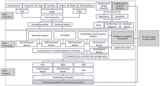 Participants rated 30 word items for similarity, and the mean similarity matrix was calculated. To conduct a comprehensive analysis of the sentiment words related to architecture, three methods were employed: Principal Component Analysis (PCA), Multidimensional Scaling Analysis (MDS), and Unidimensional Scaling Analysis (UDS). These methods were used to process and analyze the data from the average similarity matrix, ultimately leading to the development and validation of a two-dimensional coordinate annular model of architectural sentiment words. Finally, the collected words related to architectural elements, architectural perception, and emotions were structured to generate a three-layered circular model.