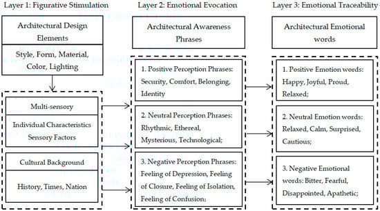 The three-layer circular model (Figure 9, Table 8) proposed in this paper provides a systematic framework for emotional architectural design. The third layer is the architectural emotion layer, which contains 30 emotion words such as “excitement”, “comfort”, “shock”, etc., reflecting people’s emotional experience after interacting with the building. The second layer is the architectural cognitive layer, which consists of 60 words describing architectural qualities (e.g., sense of rhythm, sense of sacredness), translating emotional needs into cognitive expressions. The first layer is the architectural element layer, covering design elements such as spatial layout, color, and material, which trigger the user’s perception and emotion through morphological expression. The three layers are interlocked, building a logical path from emotional needs to design implementation.