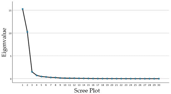 The scores for the similarity of the 435 word pairs were transformed into a word matrix of 30 words × 30 words for each participant. The word matrices were computed using Principal Component Analysis (PCA) in SPSS version 26 to obtain the potential relationships between each word factor. In order to control for acquiescent differences, calculations were performed by subtracting the median (centered value) from each participant’s score prior to analysis; this was performed to obtain a better two-dimensional feature structure that would represent the data relationships for the architectural affective words. The fit measure (‘dispersion’ ranging from 0 to 1) was 0.95. In order to remove the collinearity problem, we used the covariance analysis (ANOVA) model to process the original architectural sentiment word data, merged them into independent indicators, and extracted two groups of indicators that could fully reflect the overall information for subsequent analysis. After KMO and Bartlett’s test, the KMO values of the first three groups were 0.51, 0.85, and 0.91, respectively. The KMO values higher than 0.6 were taken as the final eigenvalues. At the same time, using Bartlett’s Test, p was less than 0.01, indicating that there was sufficient correlation between the variables and it was statistically significant (Table 5).