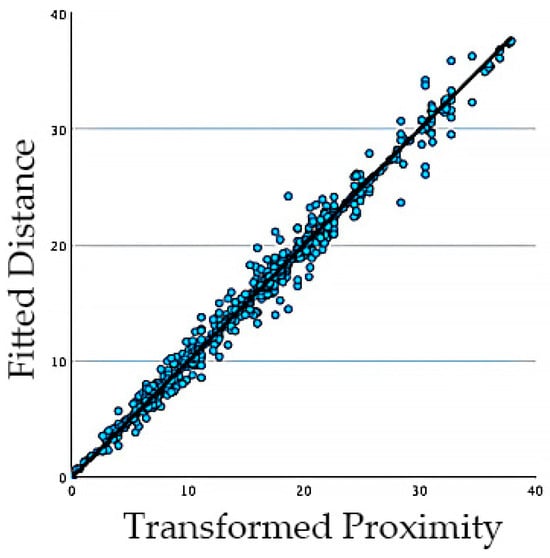 In the analysis, the dependent variable was treated as an ordered scale, so the neighboring variables of the model were set to be ordered. Since the data consisted of ratings of 435 word pairs, to avoid bias, the “unbind bound observations” function was used to solve this problem. A weighted Euclidean model was used as a standard model to solve the problem of individual differences in ratings within participants and the problem of not being able to rotate, using the importance of each dimension for each participant as the dimension weights. The model is a lower triangular matrix where the approximations are analyzed using similarity analysis. The initial setting for the model’s multidimensional scaling was Torgerson. Stress values were computed iteratively by adding one dimension at a time until their stress values approached 0.01. As the dimensions increase, the stress value decreases until a dimension no longer decreases significantly, and the maximum number of iterations is set to 100. The fit of the model is 0.20 for poor, 0.10 for fair, and 0.05 and below for good []. In the present results, the stress value keeps decreasing and the iteration stops when the calculation appears to be in the third dimension and the stress value is less than 0.001. At this point, all obtained RSQ values are 0.986 and stress values are 0.05. These values are in accordance with the criteria for a good fitting model. The 2D model of MDS obtained by calculating all the above is shown in Figure 8.