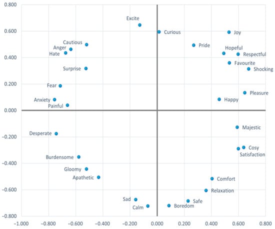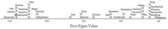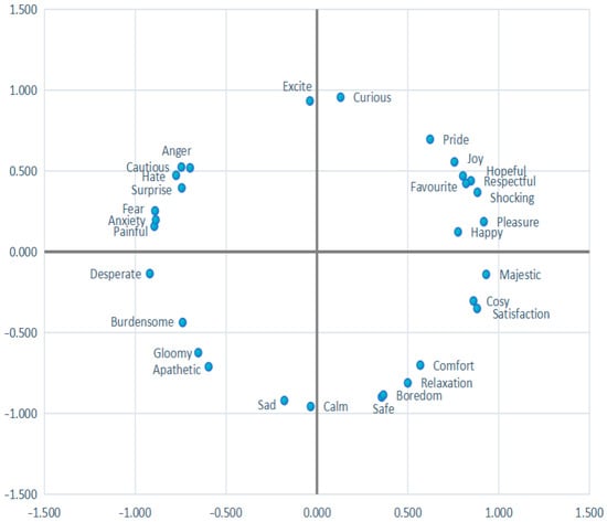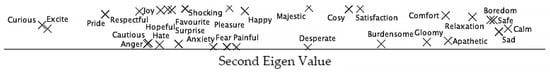 As shown in Figure 7, in dimension two, words that represent positive qualities such as “comfort”, “safety”, “relaxation”, etc., have a positive correlation with “Activation”. Words with very low values of “Activation” are on the right side of the second dimension with words with high values of “Activation”, such as “Excite”, “Curious”, etc., which represent negative emotions. “Despair” and “Fear”, which represent negative emotions, are in the middle of the second dimension, and are associated with “Pleasure”, “Happiness”, “Joy”, and “Reverence”. Therefore, the characteristics of this dimension are related to the degree of “activation” of the emotion, not to the potency of the emotion, and it also shows that the second dimension is related to the independent self. the second dimension is related to the experience of an independent sense of self (seeing the self as embedded in social relationships with others) [,]. As the second dimension carries a secondary amount of information, “Curious” and “Excite” appear as the negative direction of the one-dimensional map and “Relaxation”, “Safe”, and “Calm” appear as the positive direction of the one-dimensional graph []. From Figure 7, it is observed that “Curious” and “Excite” are very close to each other and need to be used as “Curious”, with “Excite” as the dependent variable, and utilize the regression model to calculate them separately.