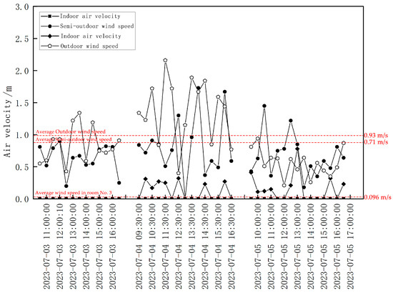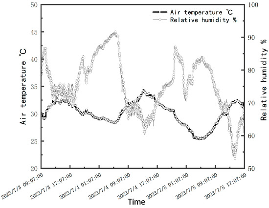 Throughout the entire measurement period, outdoor temperatures showed a small fluctuation range, with a maximum daily temperature difference of 4.2 °C. The highest temperature recorded was 34.2 °C, occurring at 1:30 p.m. on 4 July, while the lowest was 28.2 °C at 9:30 a.m. on 5 July, with an average temperature of 31.84 °C. During the measurement period, the relative humidity of outdoor air ranged from a minimum of 55% at 2:00 p.m. on 5 July to a maximum of 83.1% at 10:30 a.m. on 3 July, with an average of 68.38%.