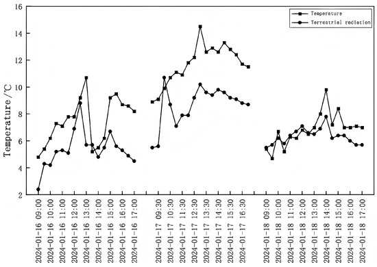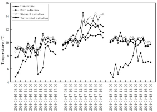 Outdoor temperatures showed a small fluctuation range, with a maximum daily temperature difference of 10.9 °C. The highest temperature recorded was 15 °C, occurring at 1:14 p.m. on 16 January, while the lowest was 1.3 °C at 5:25 a.m. on 18 January, with an average temperature of 5.95 °C. Due to the overcast and rainy weather on 18 January, the relative humidity ranged from 30% to 80.3%, with an average of 53.09%.