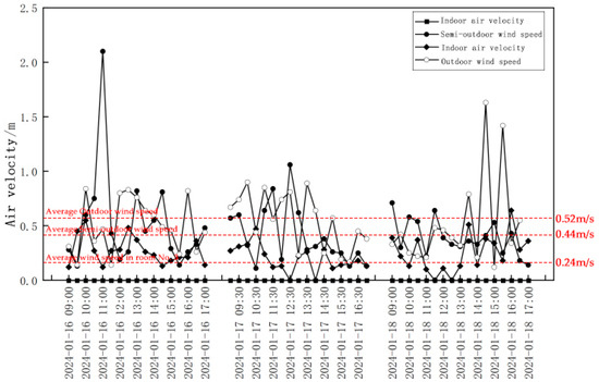 During the measurement period, the indoor airflow rate was measured with all windows closed and only the entrance door opened, resulting in a small opening area. Measurements were taken at the entrances of two rooms, revealing that indoor wind speeds were essentially negligible in the Chuanjing Building during both summer and winter. The average airflow rate at the entrance of the Antique Hall during summer was 0.096 m/s (Figure 12), which was very low, while the winter average wind speed was 0.24 m/s (Figure 13). Outdoor wind speeds were measured at the corridor and the atrium of the rotunda (Figure 14 and Figure 15). The results indicate that the average airflow rate in the corridor during summer was 0.71 m/s, while it was 0.93 m/s in the atrium. In winter, the airflow rate at the corridor averaged 0.44 m/s, and the airflow rate at the atrium averaged 0.52 m/s (Figure 16).