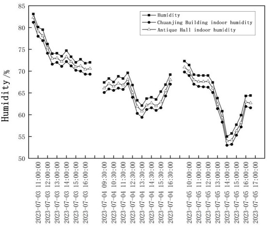 Relative humidity is a crucial indicator of the indoor thermal environment of a building. Increased humidity can impair the body’s ability to sweat, leading to an enhanced sensation to heat. Relevant research indicates that the most comfortable indoor humidity levels are between 30% and 80% RH in winter and between 30% and 60% RH in summer. The relative humidity measurements at various indoor and outdoor points are shown in Figure 17. During the measurement period in summer, the indoor relative humidity ranged from 53% to 83%. The average relative humidity levels were 68.4% outdoors, 67% in the Chuanjing Building, and 68% in the Antique Hall, with fluctuation ranges of 28.1%, 28%, and 28.3%, respectively, all exceeding the comfortable upper limit of 60% for indoor humidity in summer. However, the average relative humidity levels in the Chuanjing Building and Antique Hall were both lower than the outdoor average. This can be attributed to the moisture-regulating capacity of wooden structures and the construction techniques used in traditional residences in Southern Jiangsu, where the buildings are raised, the ground floor is compacted soil, and stone cladding is employed to enhance moisture resistance. The scripture building faces the courtyard, the outdoor space is open, and the surrounding greenery is luxuriant, affected by the transpiration of plants, accelerating the dissipation of heat, playing a cooling effect, playing a better humidity regulation effect, effectively reducing the indoor relative humidity in the scripture building, making it significantly lower than other functional rooms. The process of modern residential construction should fully consider the local climate characteristics, according to the living habits of local residents and traditional residential construction mode, which can be wooden materials, stone, and modern steel mixed with each other, cleverly used for timber for exterior walls, roofs, doors, windows, and other parts of the stone used for the exterior walls, floors and decorative parts of the building structure to ensure the safety, solidity at the same time the use of stone, wood and desorption of moisture absorption and desorption While ensuring the safety and stability of the building structure, utilizing the moisture absorption and desorption of stone and wood to effectively regulate the indoor humidity, its unique texture and texture also adds a unique charm to the building, in line with the concept of energy-saving design of modern buildings.