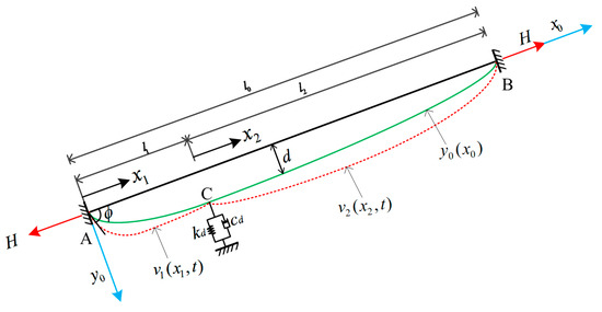 For cables installed with transverse dampers in a cable-stayed bridge, the mechanical model can be simplified as in Figure 1. The model considers the cable force, sag, bending stiffness, inclination angle boundary condition, and mass per unit length, along with the damper stiffness, damping coefficient, and position, providing a more accurate representation of the actual cable system. In the model, the transverse damper is approximated as a linear damper, represented by the combination of a linear spring and a viscous damping element [18]. In Figure 1, the stiffness of the linear spring is , and the damping coefficient of the viscous damper is . Under static action, the transverse damper has no impact on the cable. represents the static configuration of the cable, accounting for sag, angle, and cable force. For shallow cables, this configuration can be approximated as a quadratic parabola. When the cable vibrates, the external damper will affect the dynamic configuration of the cable, as shown in . When analyzing the cable-damper system in Figure 1, the cable is divided into two cable segments at the position C of the damper, and coordinate systems are established for the original cable and the two cable segments. indicates the original cable AB with length; indicates the lower cable segment AC with length; indicates the upper cable segment CB with length. is the angle between the cable and the horizontal plane, and d is the sag of the cable in the middle span. The cable force H is the average cable force, regardless of the change along its length.