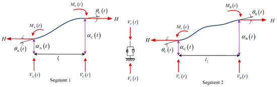 where , , , represent the bending moment amplitude, shear amplitude, lateral dynamic displacement amplitude, and angular dynamic displacement amplitude at nodes ; represents nodes A, B, and C in the cable segment.
