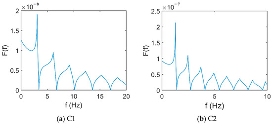 Thus, the problem of determining the frequency of the cable-damper system is transformed into finding the maximum value of Equation (14). The parameters of the cable-damper system in Table 1, which correspond to an actual existing cable, are used to analyze the characteristics of the frequency function of the system. During the analysis, for C1, the variation range of frequency is 0.01 Hz–20 Hz; for C2, the variation range of frequency f is 0.01 Hz–10 Hz, and the frequency change intervals are all 0.01 Hz. The variation curve of the characteristic frequency function with frequency is obtained by Equation (14), as shown in Figure 3.