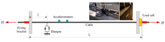 The experimental field photos of the cable experiment with damper installed as in the literature [21] are shown in Figure 4. The cable experiment adopts a horizontal cable with a fixed length of 61.8 m at both ends, and the damper is installed at a position away from the end. Install a load cell on the right end of the cable. During the experiment, the cable between the damper position and the right end is struck with a hammer, and the resulting vibration is measured using an accelerometer installed on the cable. For the validation of this paper, three working conditions were selected for validation, and the tension cable parameters and damper parameters are shown in Table 2.